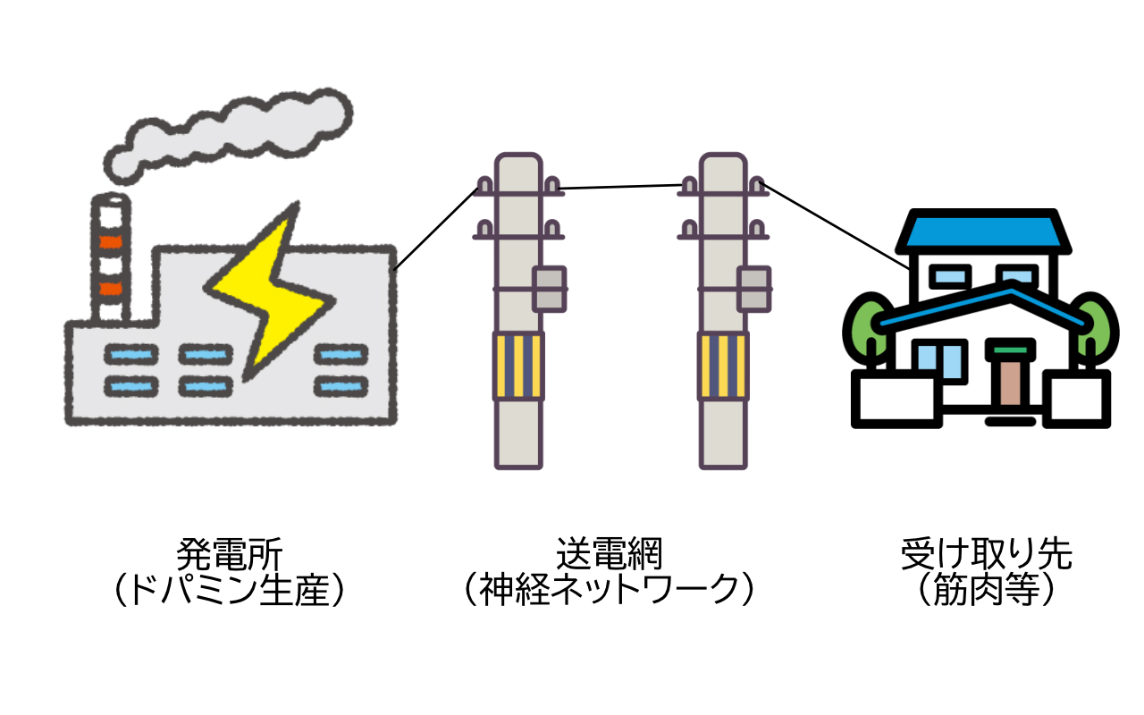 • 筋肉など(運動症状や非運動症状を起こす場所と考えてもOK)→送電された電気の受け取り先である街